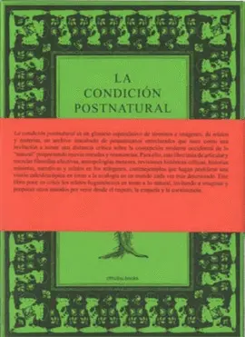 La condición postnatural es un glosario especulativo de términos e imágenes, de historias y sujetos, un archivo inacabado de pensamientos entrelazados que nace como una invitación a tomar distancia crítica de la concepción occidental moderna de lo «natural» proponiendo nuevas miradas y resonancias. Para ello, este libro trata de articular y mezclar filosofías afectivas, antropologías menores, revisiones históricas críticas, historias mínimas, narraciones y relatos en los márgenes, contraejemplos que proliferan una visión caleidoscópica de la ecología en un mundo cada vez más deteriorado. Este libro desafía las narrativas hegemónicas en torno a lo natural, invitándonos a imaginar y proponer otros mundos desde el respeto, la empatía y la convivencia. En línea con las metodologías y procesos de investigación del IPS, el libro se entiende como un proyecto colaborativo. Por ello, La condición postnatural recoge y visibiliza los proyectos e investigaciones de algunas de las personas que han pasado a formar parte de la extensa red del Instituto de Estudios Postnaturales.