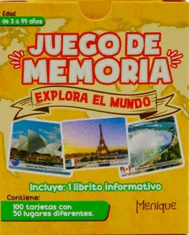 Divertido juego de memoria con hermosas fotografías de lugares emblemáticos de 50 países diferentes. ¡Viaja por el mundo mientras aprendes y agilizas la mente! Ideal para toda la familia: de 3 a 99 años. En cada tarjeta viene el lugar, país y bandera. Se puede jugar con pocas tarjetas para principiantes o niños pequeños. Contiene un maravilloso librito informativo con datos in...